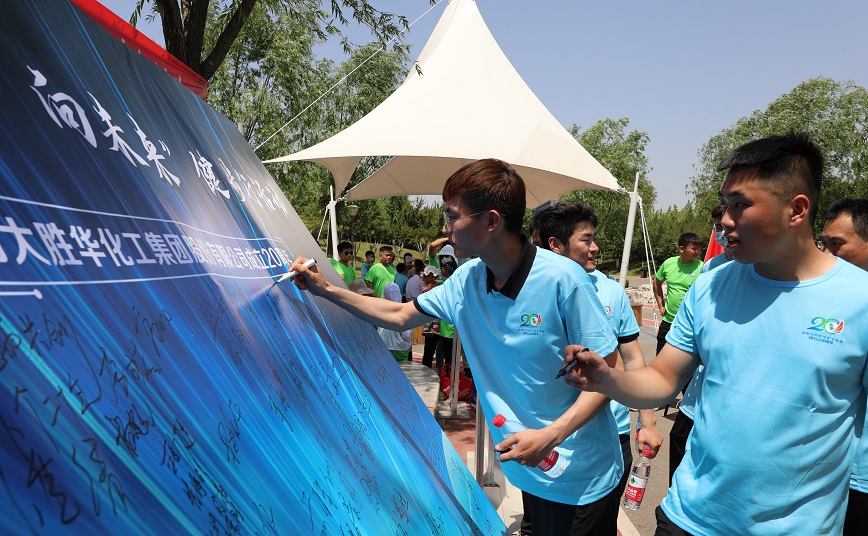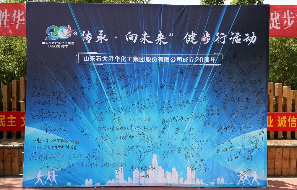 石大胜华员工高举旗帜,统一服装,随着现场所有人喊出“传承·向未来”的口号,健步行活动正式开始,每一位员工都精神饱满,迈着稳健的步伐前进,形成一道亮丽的风景线。