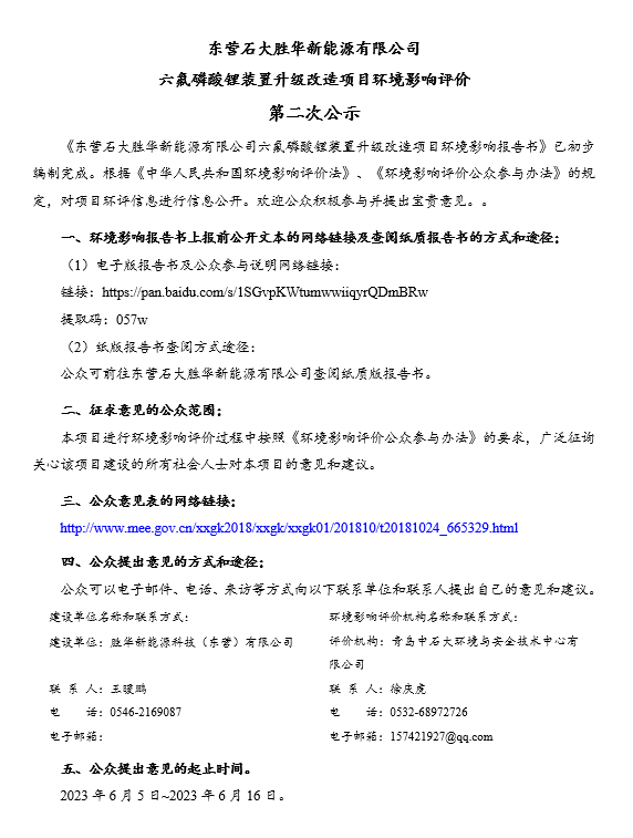东营石大胜华新能源有限公司 六氟磷酸锂装置升级改造项目环境影响评价 第二次公示