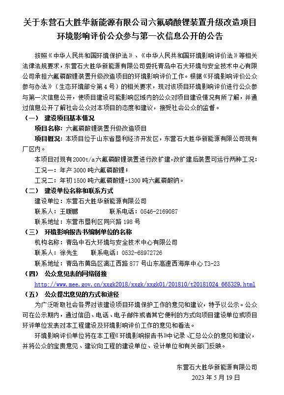 上一篇:东营石大胜华新能源有限公司 六氟磷酸锂装置升级改造项目环境影响评价 第二次公示 下一篇:东营富华达远新材料有限公司环境信息公开表(2023年第一季度)